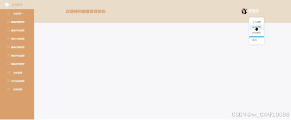 管理员登录进入健康管理系统可以查看首页、用户管理(管理员、用户)信息管理(健康档案管理、健康评估管理、评估分析管理、健康咨询管理、风险评估管理、风险建议管理)等信息,如图4-8所示。