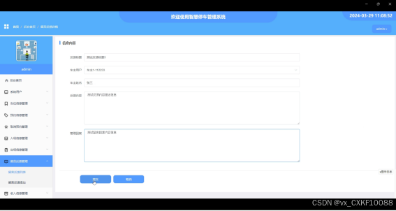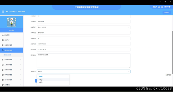 管理员查看和管理用户的停车预约信息。管理员登录系统后,进入预约管理界面,可以查看用户的预约记录,包括预约时间、车位信息等;确认、取消或调整预约信息;生成预约报表和统计数据。通过预约信息管理,管理员可以有效监控停车场的预约情况,调配停车资源,提高停车场的运营效率和用户满意度。界面如下图所示。