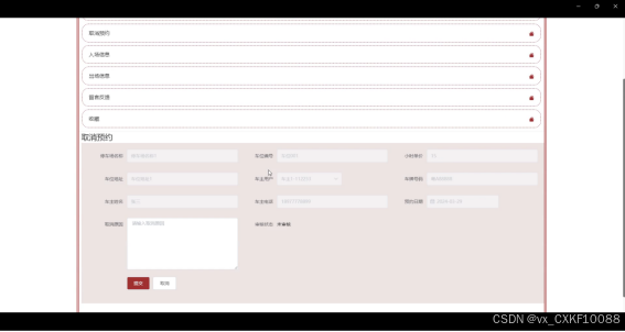 用户在系统中取消已预约的停车信息。用户登录后进入个人预约信息页面,找到需要取消的预约记录,点击取消按钮进行操作。系统验证用户身份和预约信息,确认取消后释放车位资源。用户可以及时取消不需要的预约,避免资源浪费,提高停车场资源利用率。这一功能简单方便,为用户提供灵活的停车管理服务。界面如下图所示。