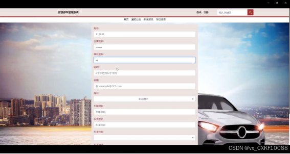 车主用户注册时填写个人信息,包括用户名、密码、邮箱等,点击注册按钮进行注册。系统验证信息格式,如用户名唯一性、密码复杂度等,成功注册后跳转至登录页面。用户可以使用注册信息登录系统,享受预约停车、查看车位信息等便利功能。界面展示如下图4.1所示。