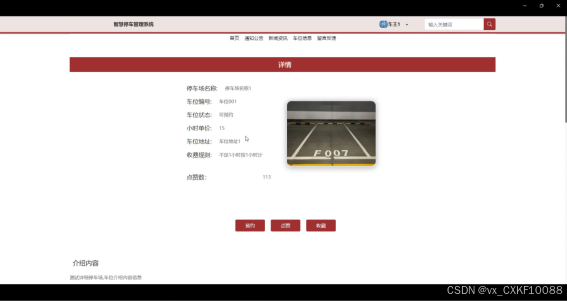 车主用户可以在系统中查看车位信息,包括车位位置、状态等,并进行预约、点赞和收藏操作。用户可以预约心仪的车位,确保停车需求得到满足;可以点赞喜欢的车位,为其他用户提供参考;还可以收藏常用的车位信息,方便下次快速查看和预约。这些功能使用户能够更便捷地选择和管理车位,提升停车体验和管理效率。界面如下图所示。