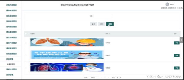 - 健康教育管理:管理员可以查看健康教育列表中某一健康知识的详情和评论信息,可以对健康教育信息进行查询、添加和删除操作。