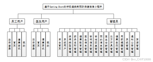 按照基于Spring Boot的呼吸道疾病预防保健微信小程序的功能模块,主要包括用户端(普通用户、医生用户)和管理端(管理员)这两大功能模块。