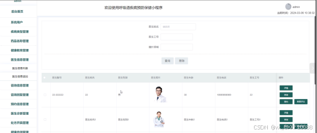 - 医生信息管理:管理员可以查看医生信息列表中某一医生的详情、评论咨询和预约信息,可以对医生信息进行查询、添加和删除操作。