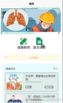 - 首页:用户可以查看首页展示的轮播图、健康教育、医生信息、健康资讯等信息。例如,用户可以左右滑动查看轮播图信息。点击“健康教育”进入页面可以查看健康教育列表信息,点击某一知识下面的“查看详情”可以查看该知识的详细内容并可以点赞、收藏、评论和下载文件。