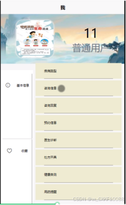 - 我的:用户点击首页右下角“我的”进入页面可以查看和管理基本信息、疾病类型、咨询信息、咨询回复、预约信息、医生诊断、处方开具、健康自测、用药提醒和收藏信息。可以对疾病类型、药品信息、医生信息、咨询信息、预约信息进行查询和重置操作;可以对咨询回复、医生诊断、处方开具信息进行添加、查询和重置操作。
