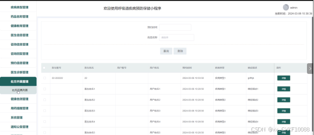 - 处方开具管理:管理员可以查看处方开具列表中某一用户的处方的详情,可以对处方开具信息进行查询和删除操作。