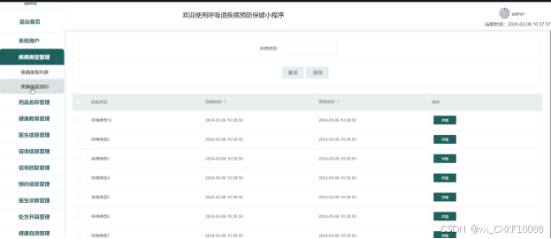 - 疾病类型管理:管理员可以查看疾病类型列表中某个疾病类型的详情,可以对疾病类型信息进行查询、添加和删除操作。