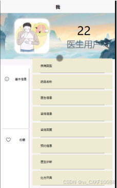 - 我的:用户点击首页右下角“我的”进入页面可以查看和管理基本信息、疾病类型、咨询信息、咨询回复、预约信息、医生诊断、处方开具、健康自测、用药提醒和收藏信息。例如,点击“基本信息”进入页面可以修改个人信息和登录密码;点击“收藏”进入页面可以查看或删除收藏列表信息。