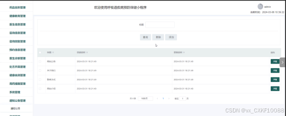 - 通知公告管理:管理员可以查看通知公告列表中某一通知公告的详情,可以对通知公告信息进行查询、添加和删除操作。
