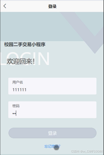 SSM应科二手购系统中的前台上注册后的会员是可以通过自己的账户名和密码进行登录的,当会员输入完整的自己的账户名和密码信息并点击“登录”按钮后,将会首先验证输入的有没有空数据,再次验证输入的账户名+密码和数据库中当前保存的用户信息是否一致,只有在一致后将会登录成功并自动跳转到SSM应科二手购系统的首页中;否则将会提示相应错误信息,用户登录界面如下图4-3所示。