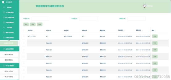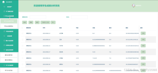 该学生成绩分析系统提供了多种功能,包括查看首页、个人中心、在线沟通、学习课程等,为学生和家长用户提供全面的成绩分析系统服务。管理员负责安全、高效地存储、管理和维护系统,同时拥有对后台操作的完整控制权,以确保系统的正常运行。
