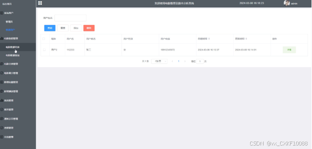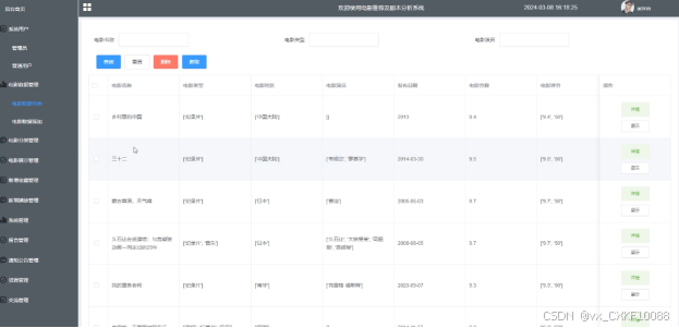 (3)电影数据管理:管理员执行管理电影数据列表,可以对电影数据进行查询、添加、重置或删除。如果需要添加数据,可以点击爬取一键新增新的电影数据,也通过下载导入文档至后台,按文档格式保存电影数据,再导入文档即可更新电影数据。