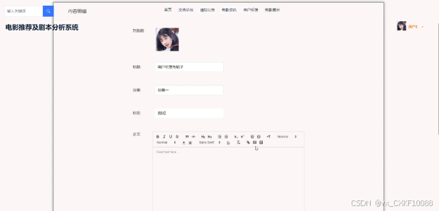 当访客点击电影推荐及分析系统中导航栏上的“交流论坛”后将会进入到该“交流论坛”列表的界面,然后选择想要看的交流论坛,点击进入到详细界面,在详细界面可以收藏+赞+评论等操作。也可以点击发布内容发布新的交流帖子。交流论坛发布界面如下图4-4所示。