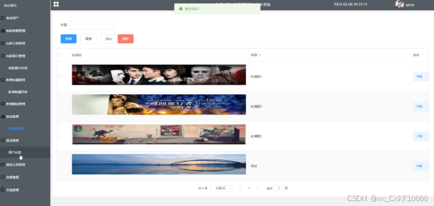 管理人员在“系统管理”这一菜单下是可以对电影推荐及分析系统内的轮播图进行添加修改的,其管理界面如下图4-12所示。