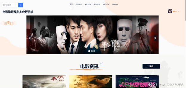 (2)查看电影推荐及分析系统的首页信息:电影推荐及分析系统的首页信息包含了首页、交流论坛、通知公告、电影资讯、用户反馈、电影展示等。