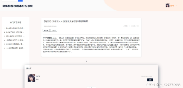 (5)电影资讯:当用户点击“电影资讯”这一菜单按钮,会显示管理员在后台发布的所有的电影资讯,可以查看详情,进行收藏、点赞、评论等。