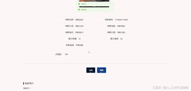(7)电影展示:用户可以查看电影展示信息,在查询到自己想要了解的电影展示信息的时候,可以进入查看详细的介绍,包括电影名称、电影编号、电影分类、电影地区、电影演员、电影分数、累计收藏、累计播放、电影视频、电影简介等信息,在电影展示详情这个界面,同时支持用户对电影进行收藏、点赞以及评论的功能。