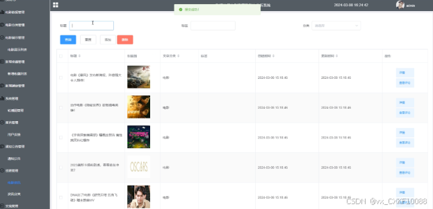 管理员点击“资源管理”菜单能够对其下子菜单电影资讯和电影资讯的分类进行增删改查。界面如下图4-13所示。