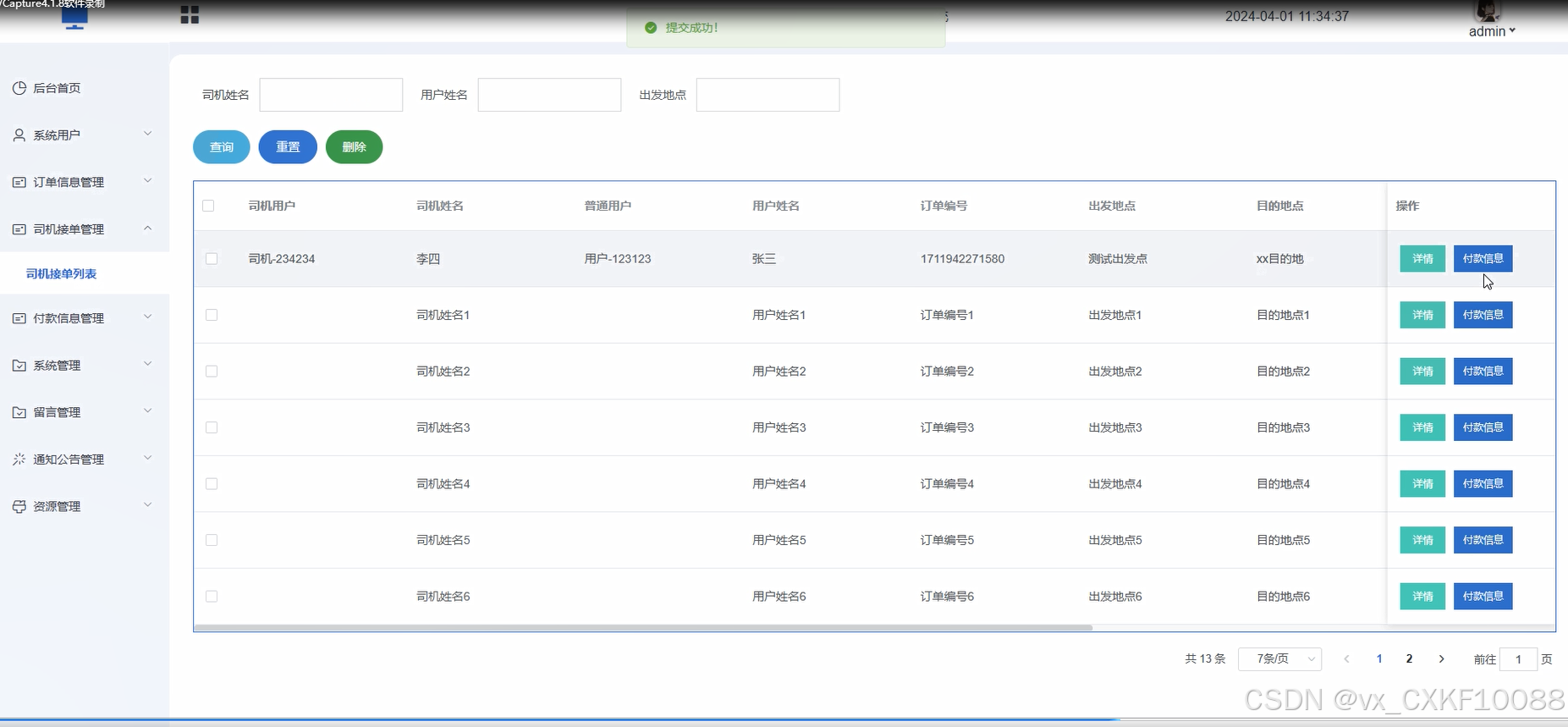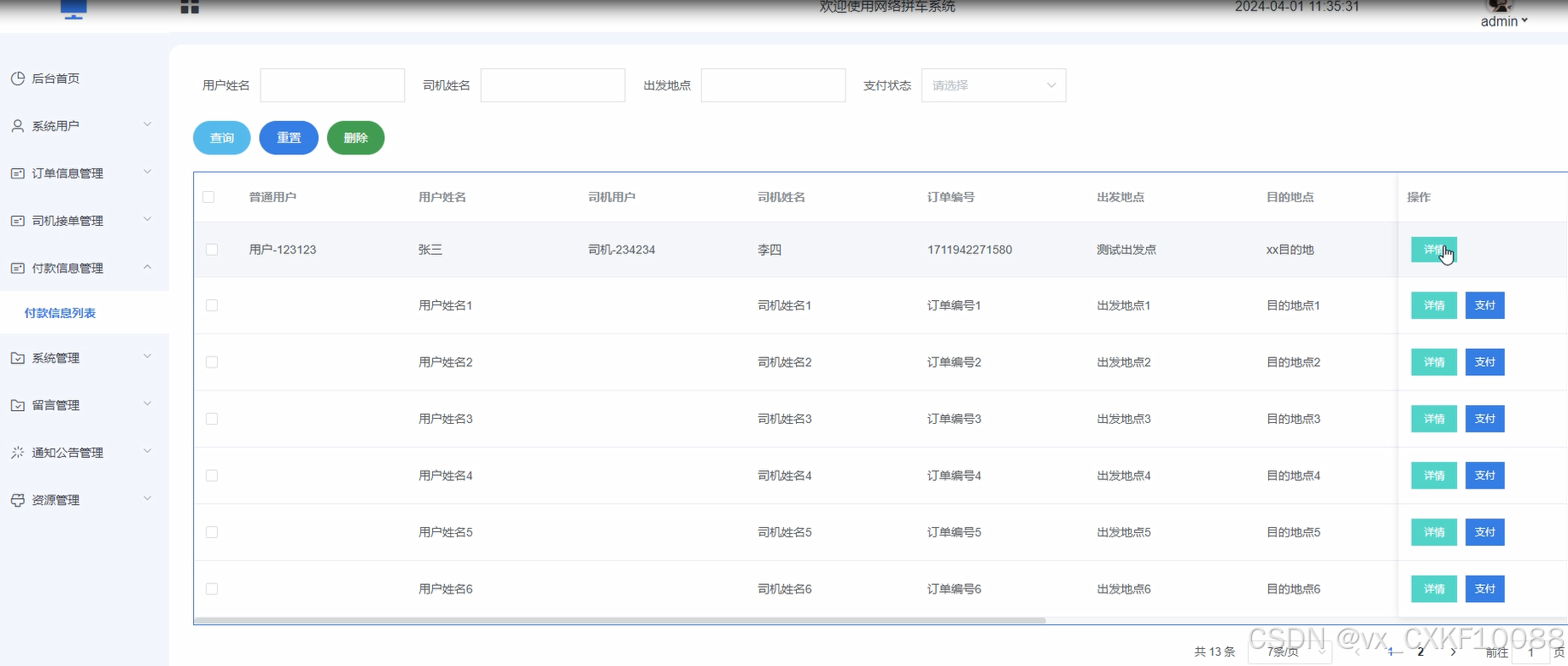 管理员可以管理系统中的付款信息,包括用户支付记录、司机收入情况等,进行审核、处理支付异常等操作,以确保交易的安全和顺利进行。界面如下图所示。