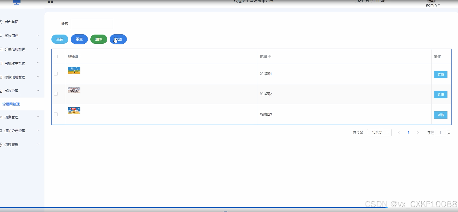 管理员可以对系统前台展示的轮播图进行增删改查,方便用户进行查看。轮播图管理界面如下图所示。