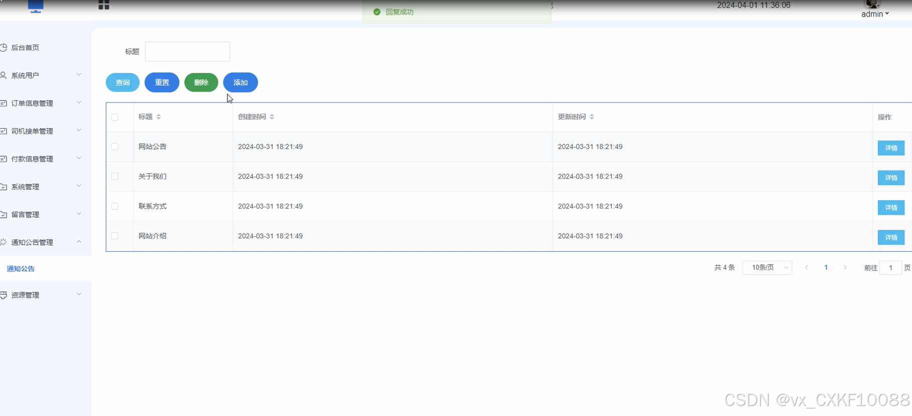 管理员可以对系统前台展示的公告信息进行增删改查,方便用户进行查看。通知公告界面如下图所示。