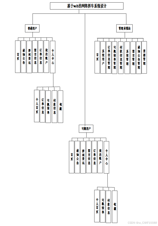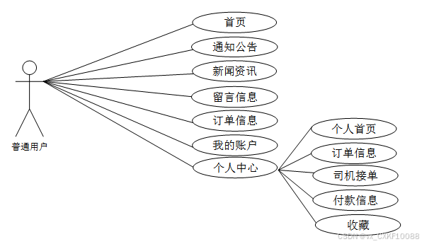 网络拼车系统包含普通用户、司机用户和管理员三个角色划分,三大角色主要功能如下: