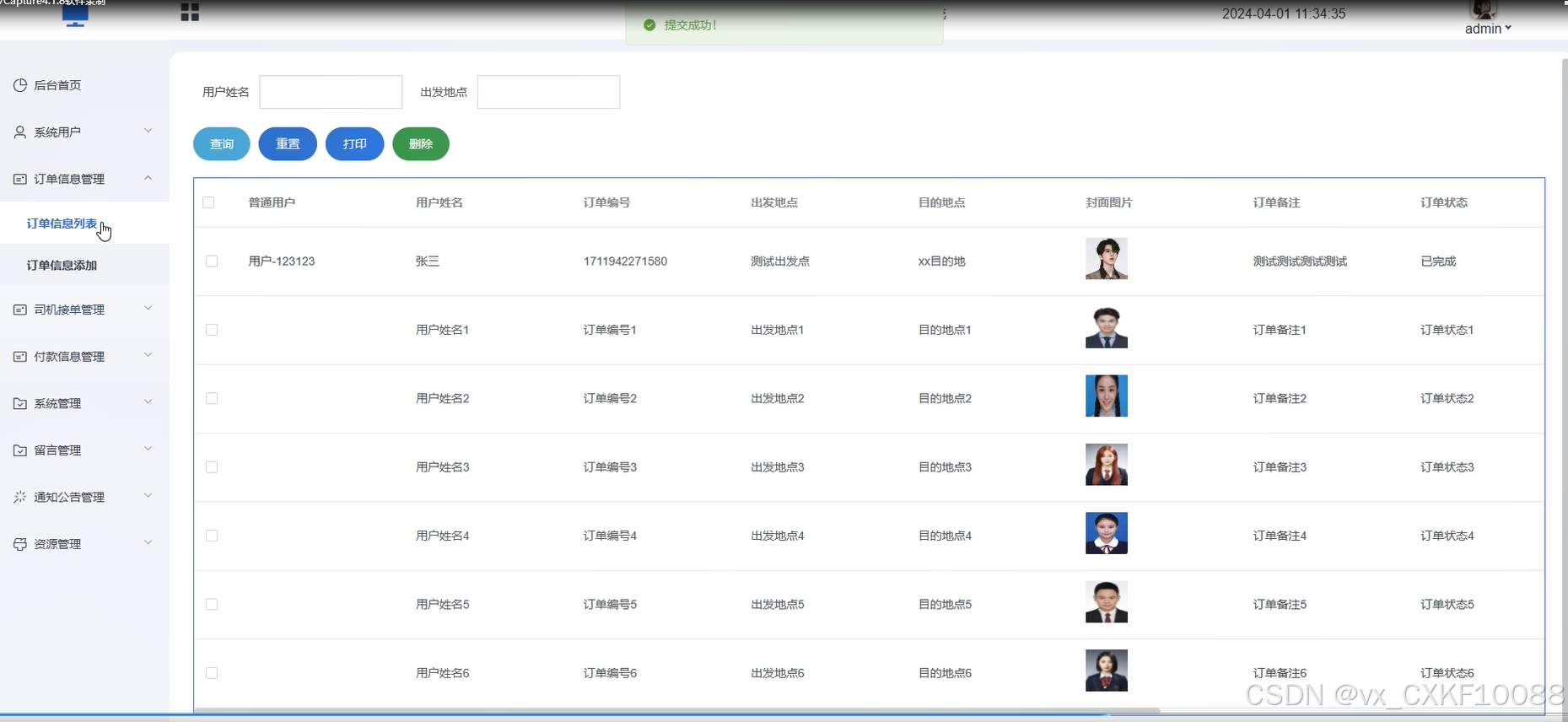 管理员可以管理系统中的订单信息,包括订单状态、订单备注、订单编号等,进行审核、修改或删除订单等操作,确保订单信息的准确性和完整性。界面如下图所示。