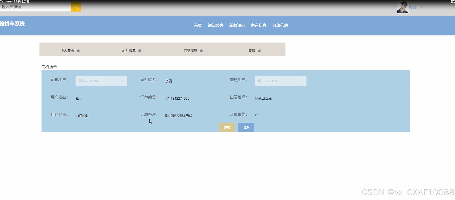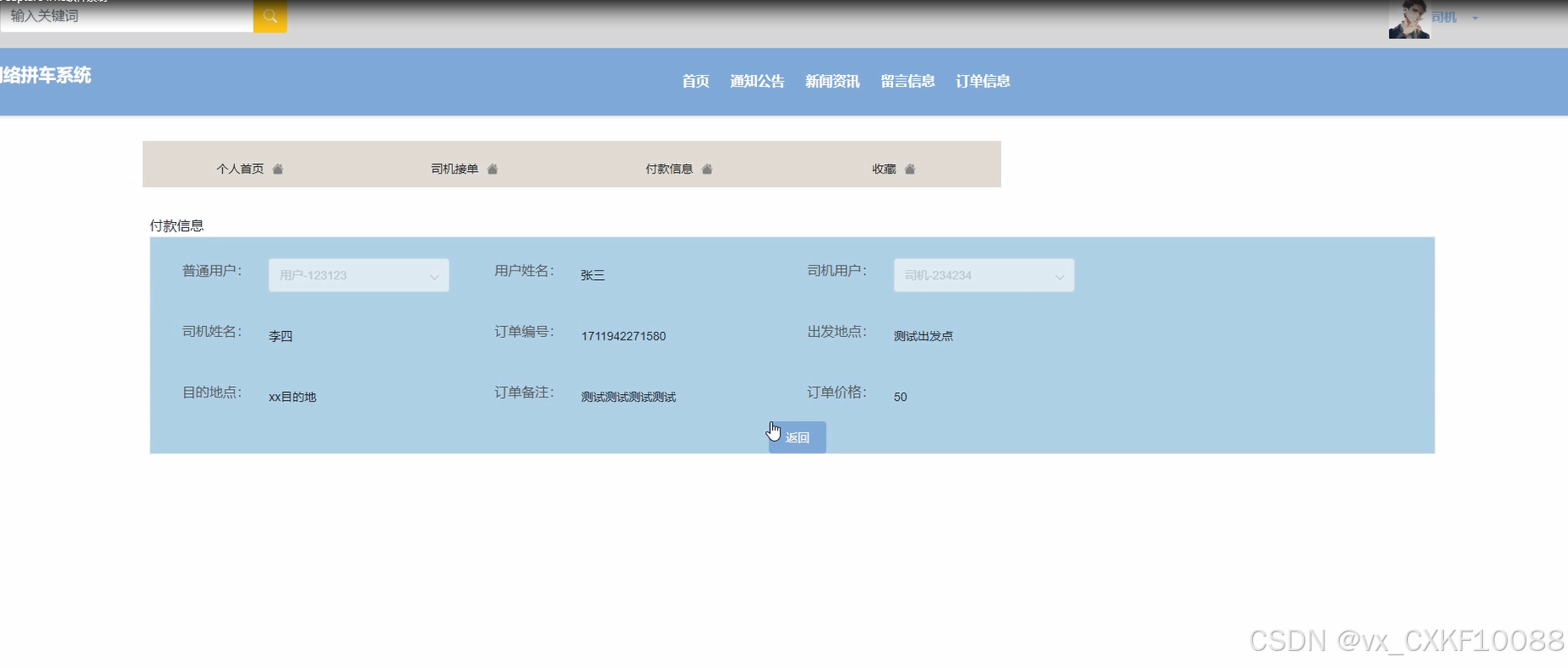 司机用户可以查看付款信息,包括司机用户、出发地点、订单价格等。界面如下图所示。