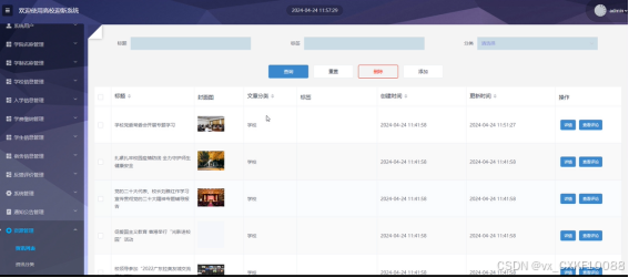 资源管理:管理员可以进行校园资讯的发布、编辑和删除操作。这包括设置资讯的标题、内容、发布日期等信息,并选择资讯的展示位置和时效性。管理员可以根据学校的需要,及时更新校园资讯,如校内活动、学术讲座、文化节庆等,以丰富用户的信息获取和参与体验。界面如下图所示。