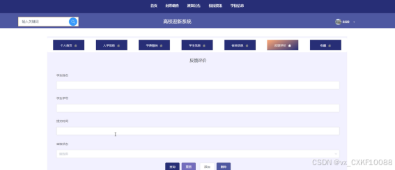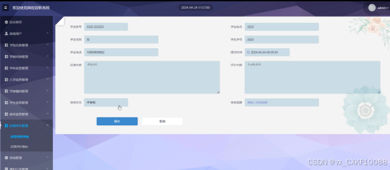 通过反馈评价管理功能,管理员可以对学生的反馈评价信息进行管理和处理。这包括删查增改,使管理员能够及时了解学生的反馈内容,并进行审核、评价、回复或采取相应措施。界面如下图所示。