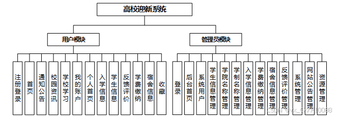 高校迎新系统用户端功能包括用户首页、通知公告、校园资讯、学校信息、我的账户,个人中心(个人首页、 入学信息 、学费缴纳 、学生信息 、宿含信息 、反馈评价 、收藏 )等功能。管理员端功能涵盖系统用户管理、学院名称管理、学制名称管理、学校信息管理、入学信息管理、学费缴纳管理、学生信息管理、宿舍信息管理、反馈评价管理、系统管理(轮播图)、通知公告管理、资源管理。共同构建一个全面服务于高校迎新的系统平台。具体功能分析如下: