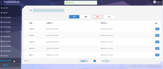 管理员可以进行通知公告的发布、编辑和删除操作。这包括设置公告的标题、内容、发布日期等信息,并选择公告的展示位置和时效性。管理员可以根据学校的需要,及时更新公告内容,如迎新事项、政策变动等重要通知,以确保用户能够及时了解学校的最新动态。界面如下图所示。