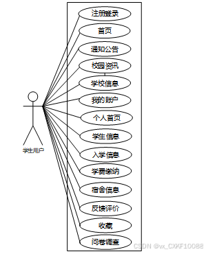 系统用例分析是对系统中各个功能模块的用户需求和行为进行分析,以识别和描述不同的用户用例。通过系统用例分析,可以深入了解用户在平台上的操作流程和交互方式,为系统设计和开发提供指导,并确保平台能够满足用户的需求和期望。高校迎新系统中学生用户角色用例图如图2.1所示:
