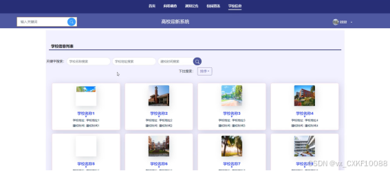 通过学校信息功能,用户可以了解学校的基本情况、、建校时间、办学理念、历史沿革等信息。系统提供详细的学校信息页面,展示学校的特色和优势,以及学校所在地的文化和环境。用户可以浏览学校信息,加深对学校的认知和了解。这有助于新生选择适合自己的学校,并促进学校形象的宣传和推广。界面如下图所示。
