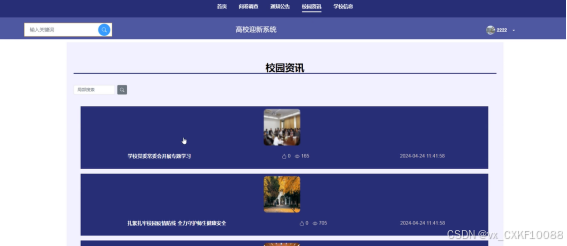 通过校园资讯功能,学校可以发布校园相关的新闻、活动等信息,为新生和其他用户提供了解学校发展和文化的渠道。这些资讯可以包括校内活动、学术讲座、文化节庆等内容。用户可以通过系统浏览最新的校园资讯,了解学校的最新动态,并参与感兴趣的活动。界面如下图所示。
