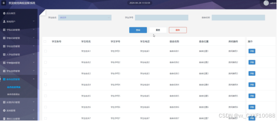 通过宿舍信息管理功能,管理员可以对学生的宿舍信息进行管理和处理。包括查看、编辑和分配新生的宿舍信息。该模块通过直观的界面和灵活的操作功能,确保管理员能够高效地进行宿舍信息管理,避免资源浪费和管理混乱。同时,该模块还支持按条件筛选和排序宿舍信息,帮助管理员快速定位和处理特定情况下的宿舍信息。界面如下图所示。