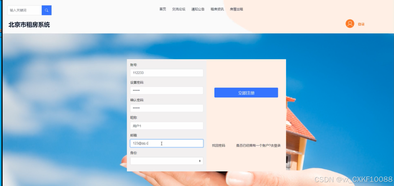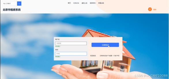 北京市房屋租赁系统的注册登录操作,用户都是从同一个注册登录页面进行注册登录,若是还未有系统账号,则进行注册操作;若是已注册账号,则用户在操作时,输入账号、密码,再选择相应的角色,如“用户”等。