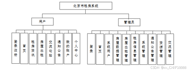 北京市房屋租赁系统划分为了管理员模块和普通用户模块这两大部分。