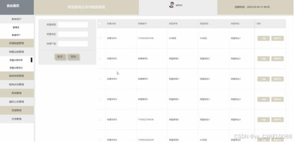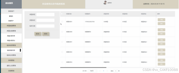 (2)房屋出租:管理员点击“房屋出租”菜单可以对查看到所有的房屋出租信息,管理员可以对其进行增删改查。