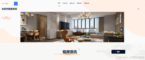 (1)首页信息:当用户进入本北京市房屋租赁系统的前台的时候,首先展示在眼前的是导航栏、轮播图等信息,用户可以根据自己个人的需求进行查看;