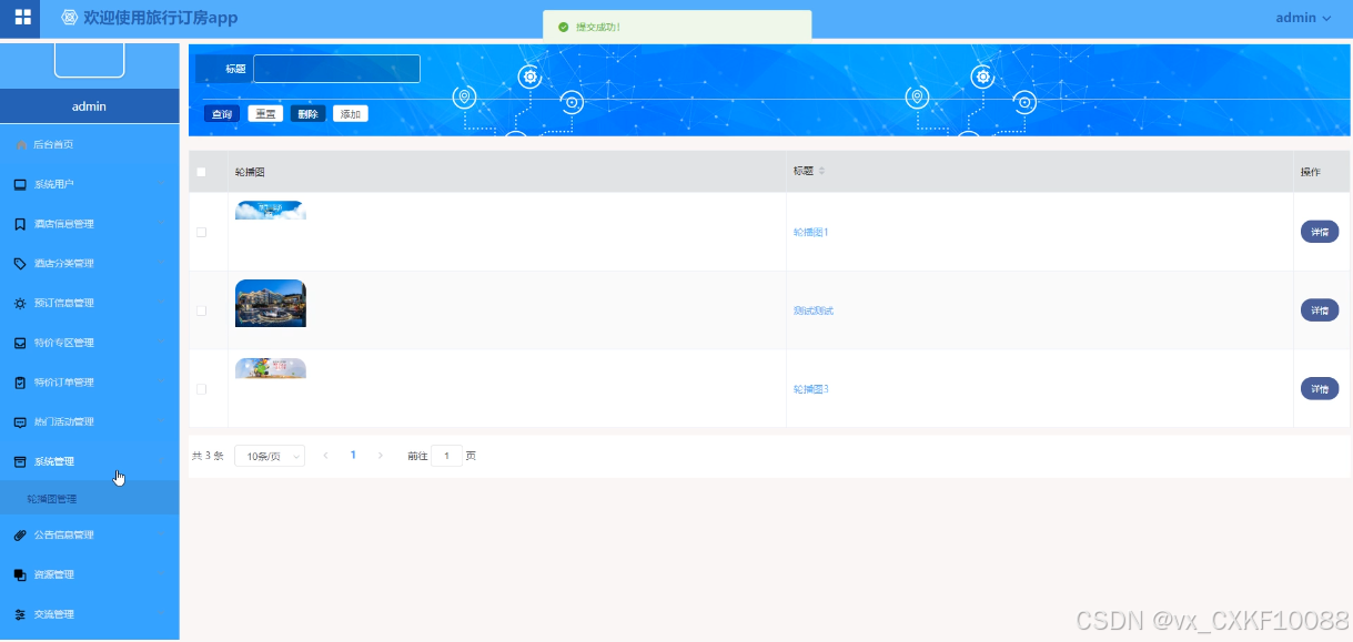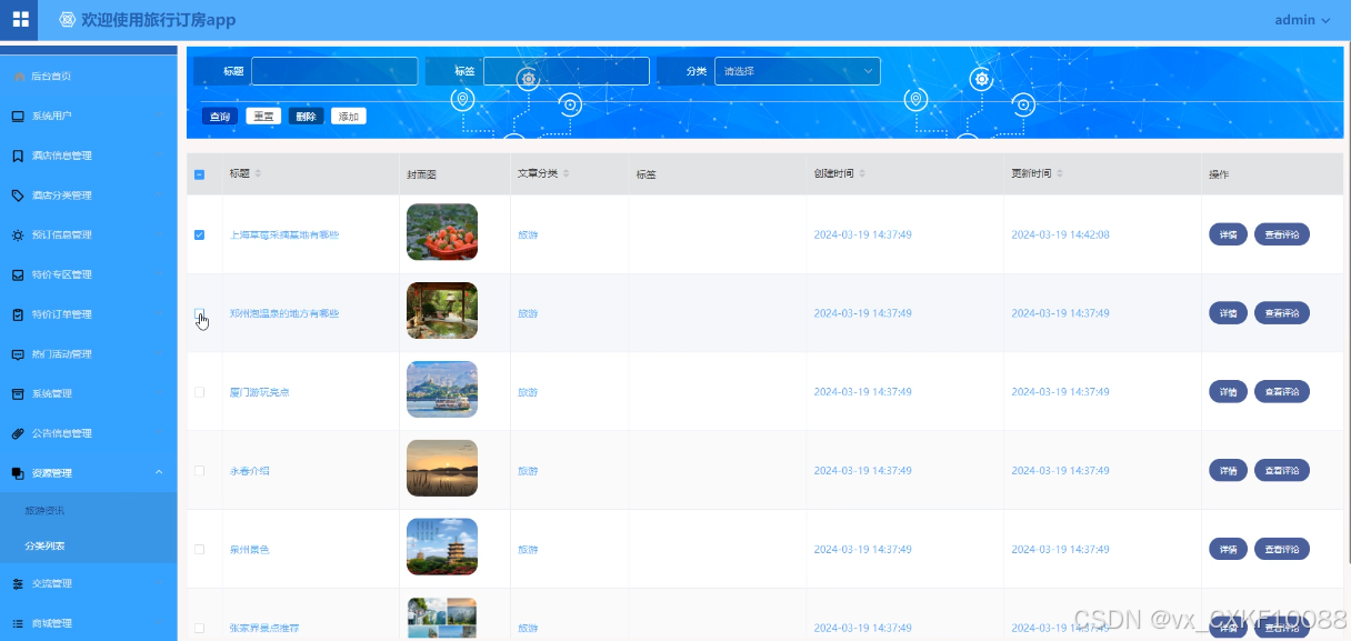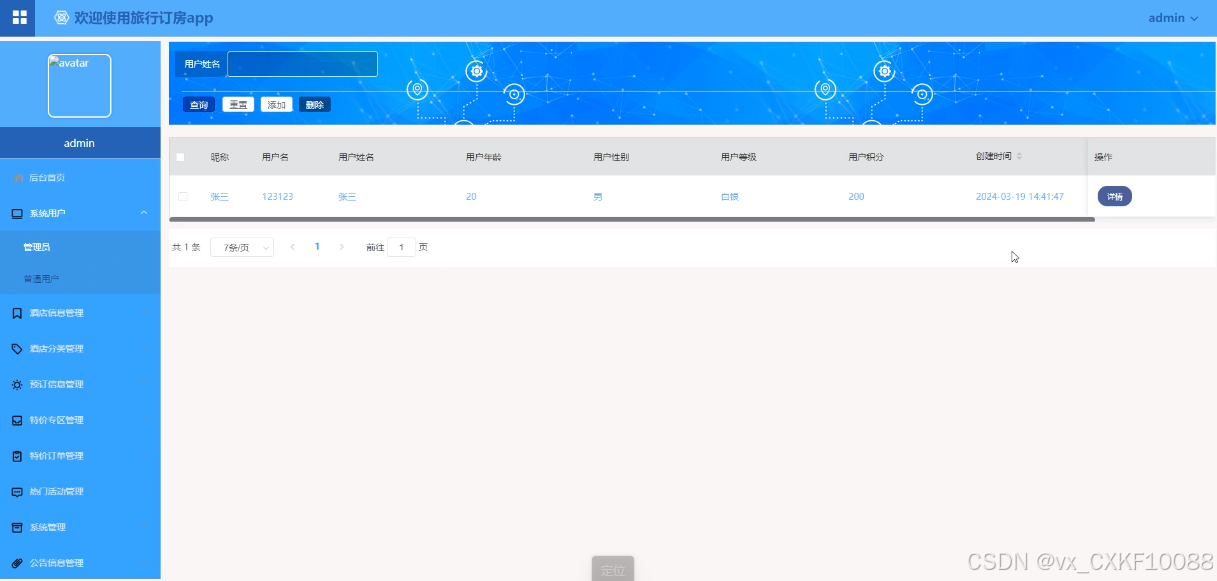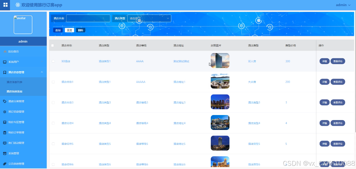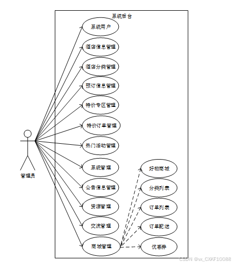 后台管理员进入以后可以对系统用户、酒店信息管理、酒店分类管理、预订信息管理、特价专区管理、特价订单管理、热门活动管理、系统管理、公告信息管理、资源管理、交流管理、商城管理(好物商城、分类列表、订单列表、订单配送、优惠券)进行管理。