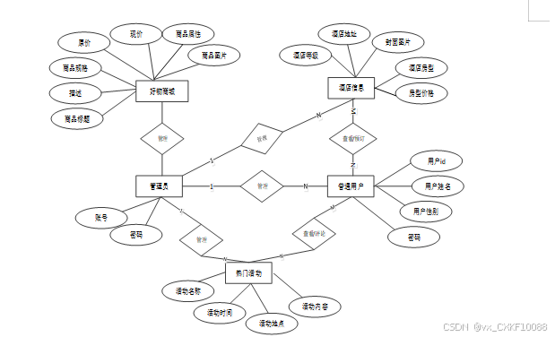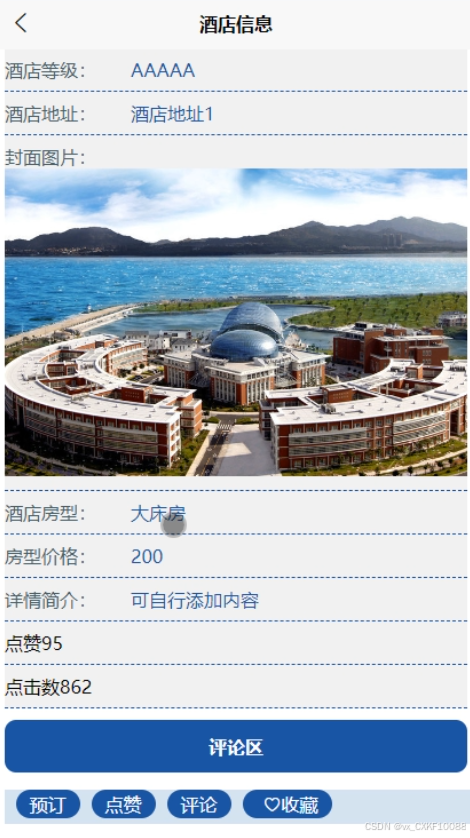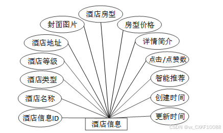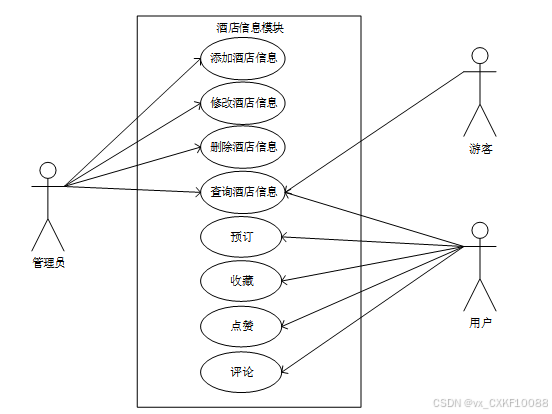 (1)酒店信息模块:管理员在后台可以对酒店信息进行增删改查,游客实现查看酒店信息,用户进行预订、点赞、评论、收藏。如下图2.1所示。