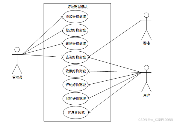 (4)好物商城模块:本旅行订房APP其中一个主要的功能就是购买好物商品,所以系统中需要管理员添加各种商品供用户查询,购买,管理员在此模块主要是对商品的增删改查,游客实现对商品的查询,用户则实现好物商品的领取优惠券、收藏、评论、加购、立即购买等操作。如下图2.4所示。