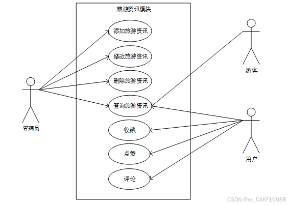 (5)旅游资讯模块:管理员在后台可以对旅游资讯及其分类进行增删改查,游客实现查看旅游资讯,用户进行收藏、点赞、评论。如下图2.5所示。