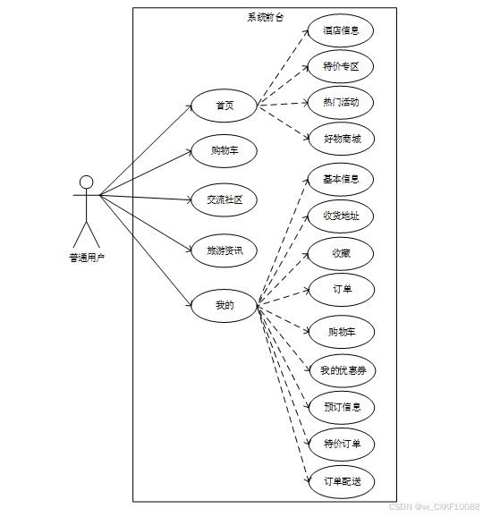 旅行订房APP前台用户的主要功能是对酒店信息的查看、预订、收藏、评论以及对好物商城商品的购买,购买的过程中需要对收货地址进行设置,对购物车进行管理,查看自己的订单。前台普通用户用例图如图2.10所示。