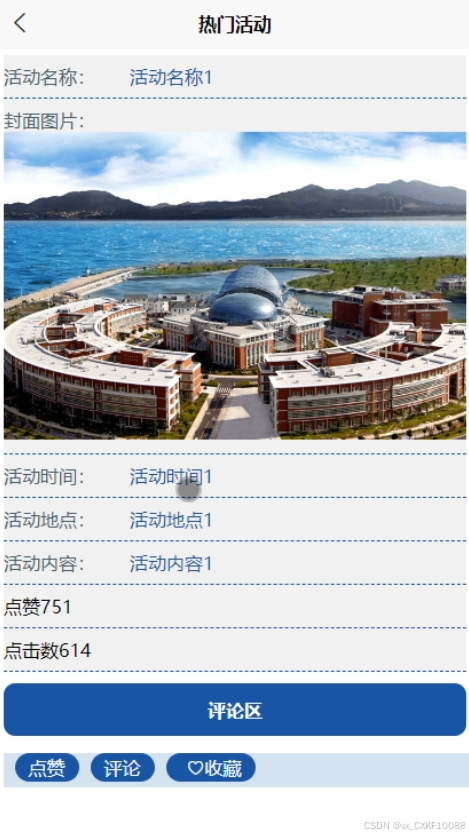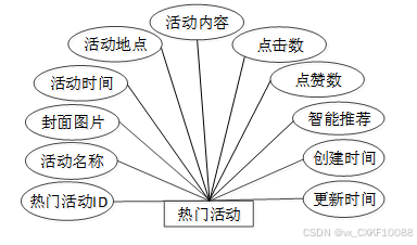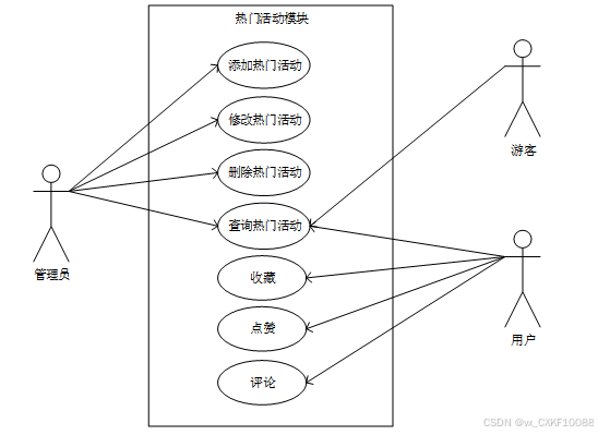 (3)热门活动模块:管理员在后台可以对热门活动进行增删改查,游客实现查看热门活动,用户进行收藏、点赞、评论。如下图2.3所示。