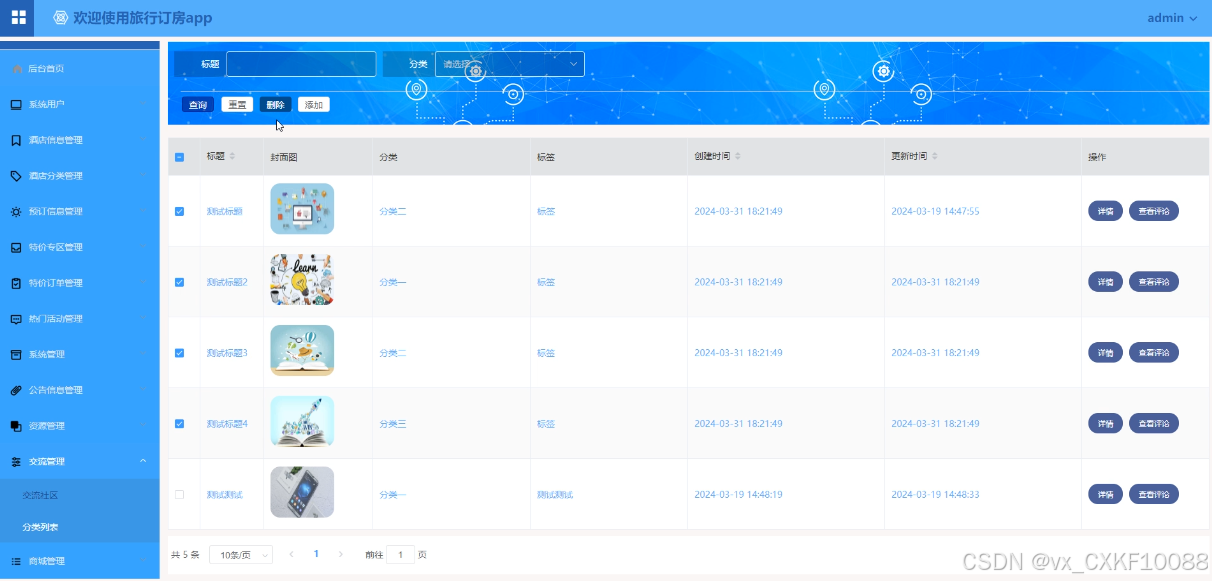旅行订房APP中的管理人员在“交流管理”这一菜单中是可以对旅行订房APP内的交流社区以及论坛分类信息进行维护和管理的。交流管理模块实现图如下所示。