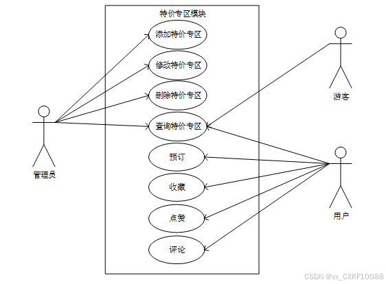 (2)特价专区模块:管理员在后台可以对特价专区进行增删改查,游客实现查看特价专区,用户进行预订、点赞、评论、收藏。如下图2.2所示。