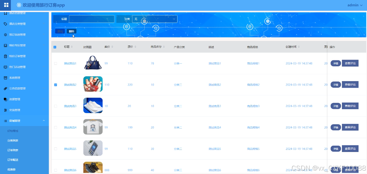 后台管理人员对旅行订房APP内的不同商品的分类下的好物商城商品信息进行维护和管理。